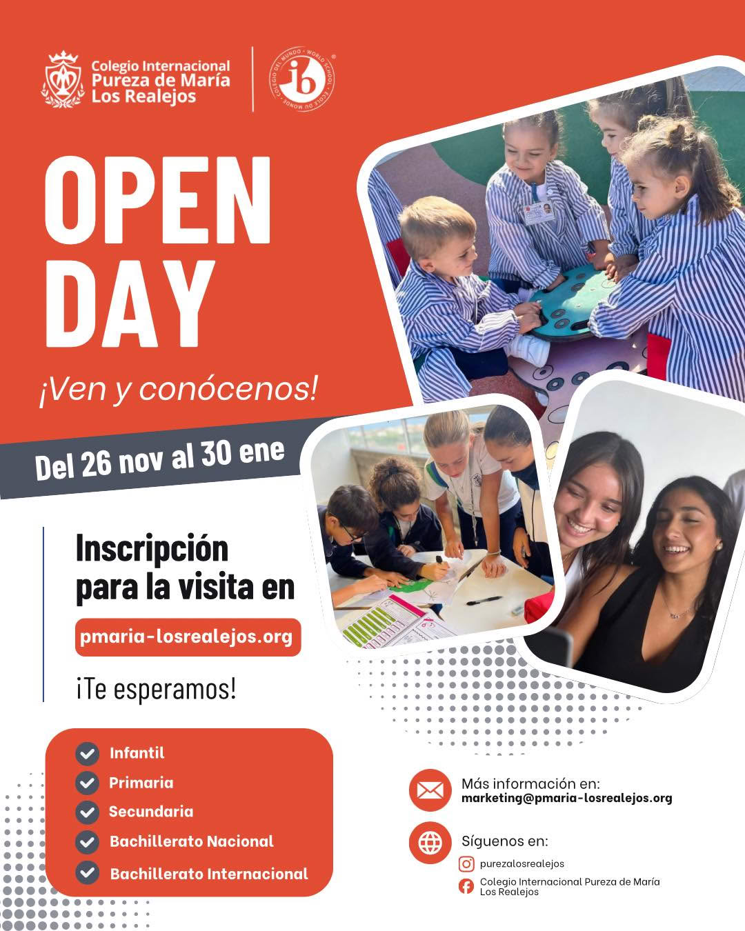 𝗜𝗻𝘀𝗰𝗿𝗶𝗽𝗰𝗶𝗼́𝗻 para la visita personalizada en www.pmaria-losrealejos.org/openday-experience. Además, podrás elegir el día y la hora de la visita.